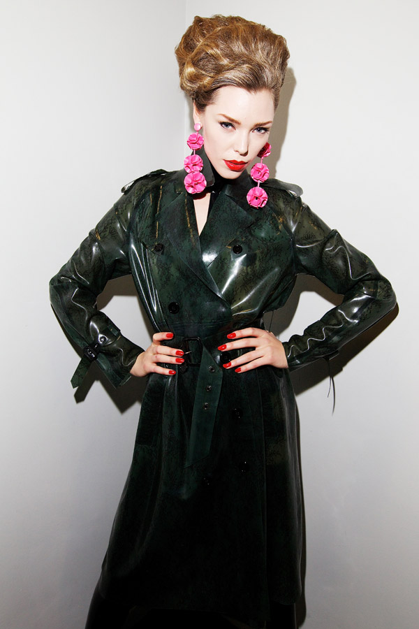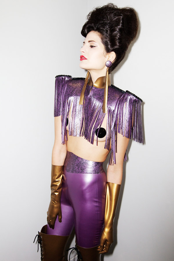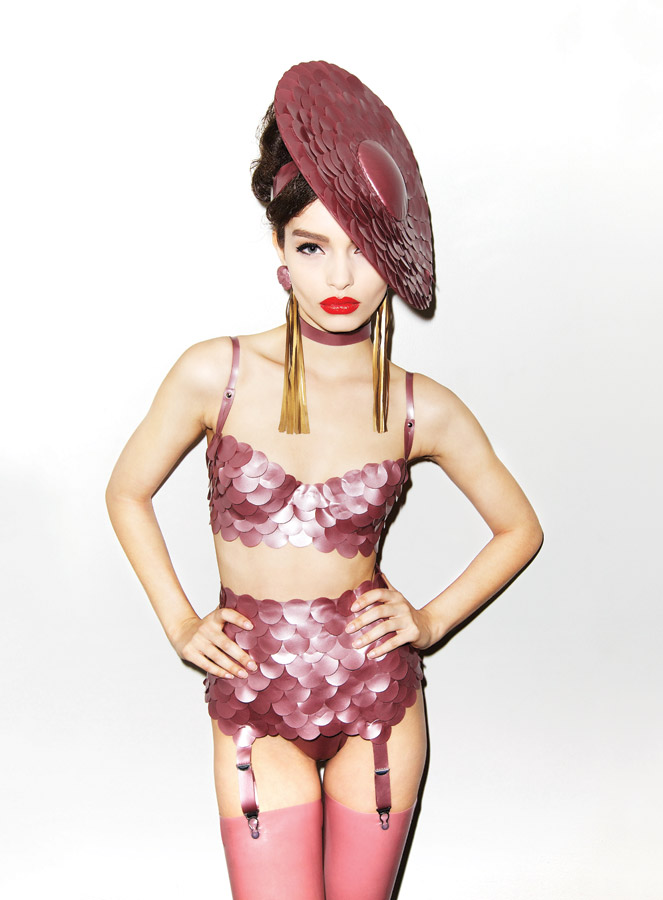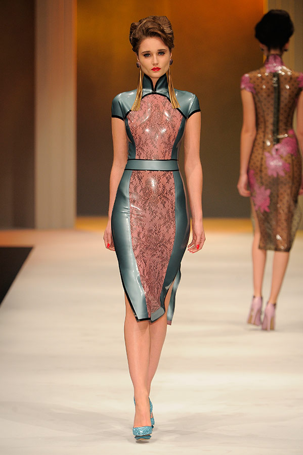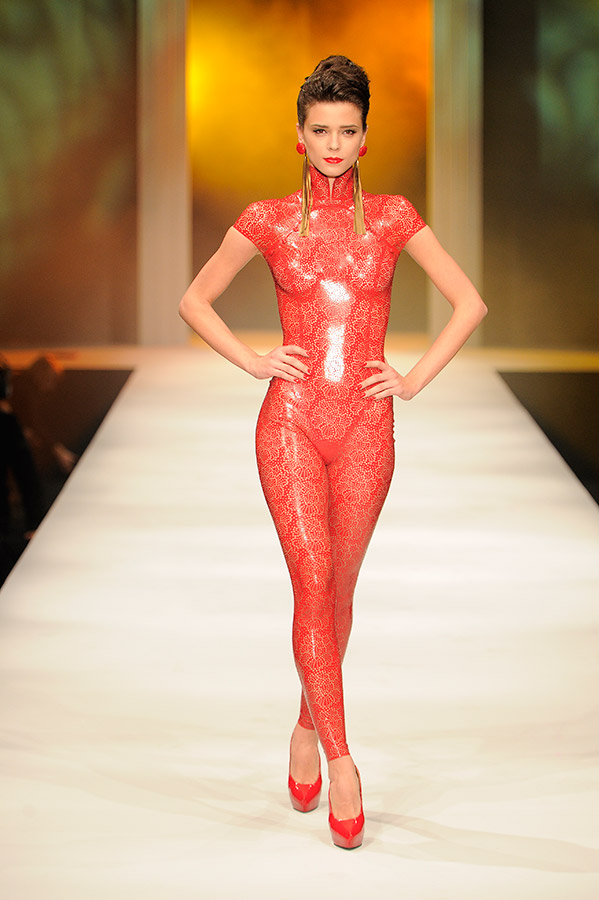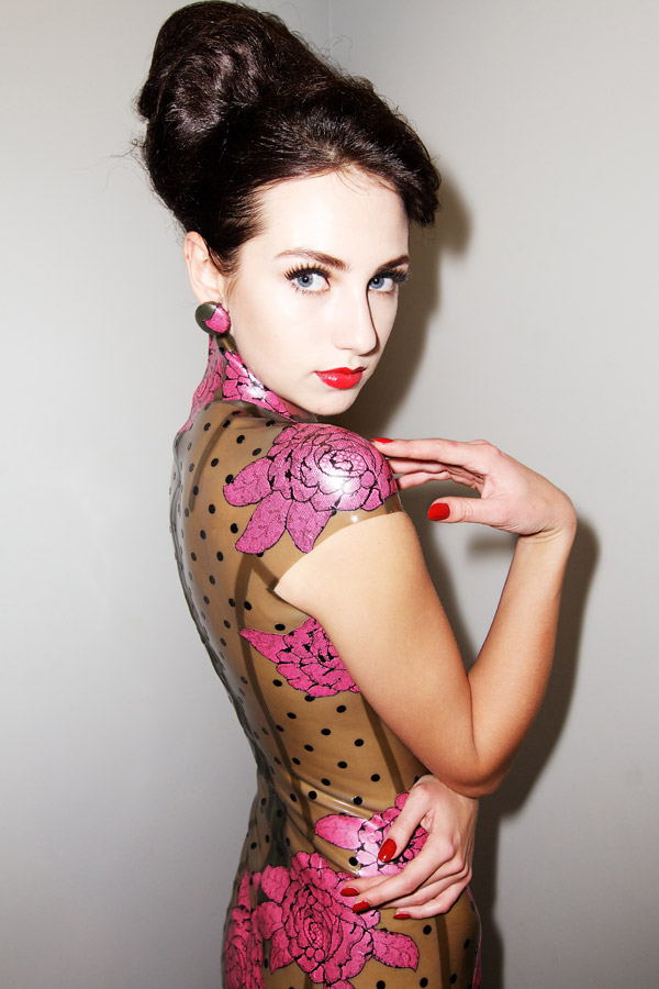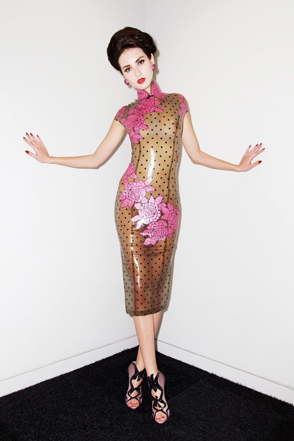 In ‘Restricted Love’ high Cheong Sam collars are viewed as neck corsets, bodies are armoured and corsetted, high boots are strictly laced and the lingerie is textured and layered. Most often the latex is cut classically tight to the skin and of course is therefore restrictive. These fetishistic elements are rendered in colours which reflect orientalism from previous times but we are placed absolutely in the present with clothes designed explicitly to enhance the mood of this moment.