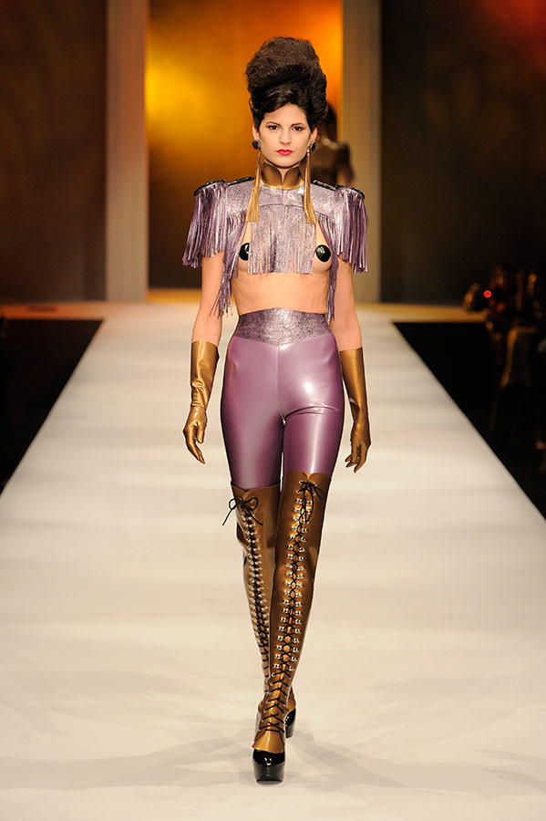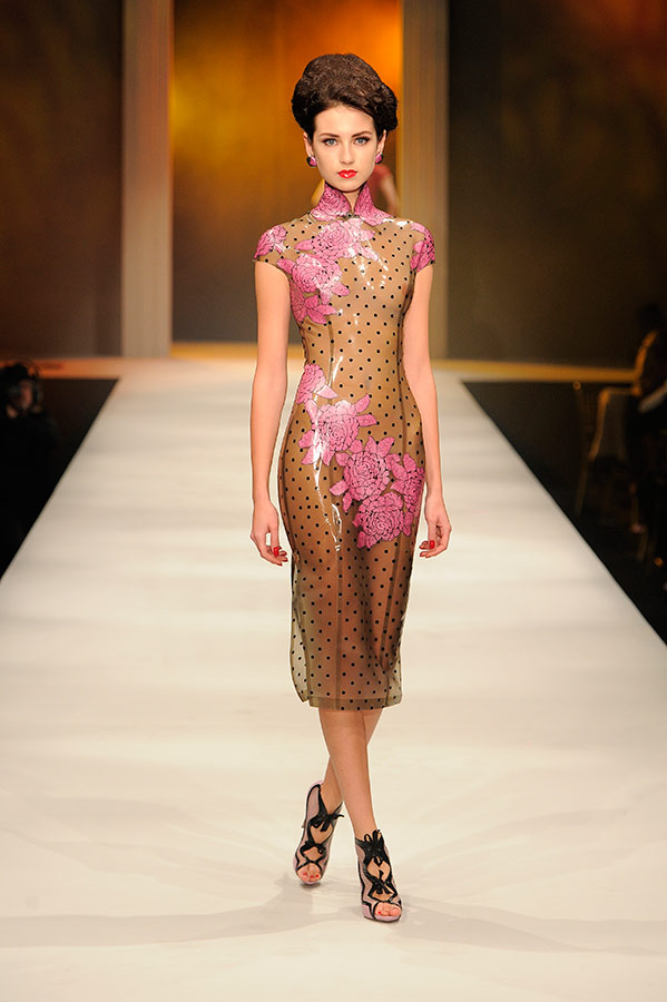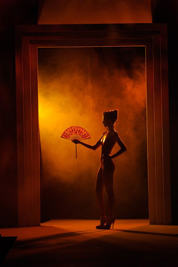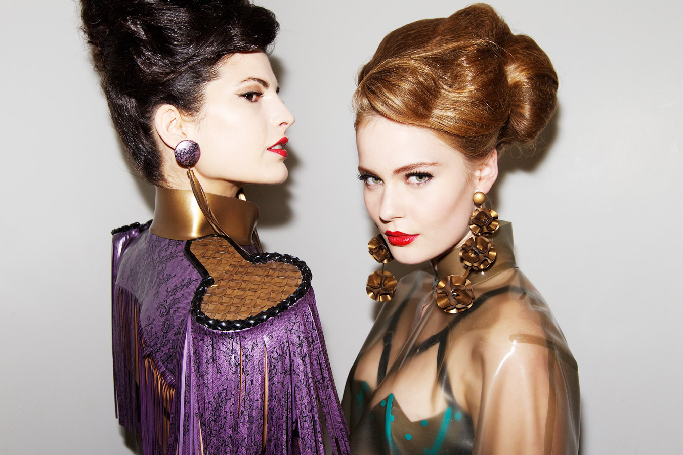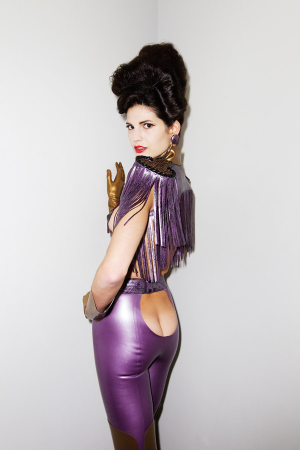 In ‘Restricted Love’ high Cheong Sam collars are viewed as neck corsets, bodies are armoured and corsetted, high boots are strictly laced and the lingerie is textured and layered. Most often the latex is cut classically tight to the skin and of course is therefore restrictive. These fetishistic elements are rendered in colours which reflect orientalism from previous times but we are placed absolutely in the present with clothes designed explicitly to enhance the mood of this moment.