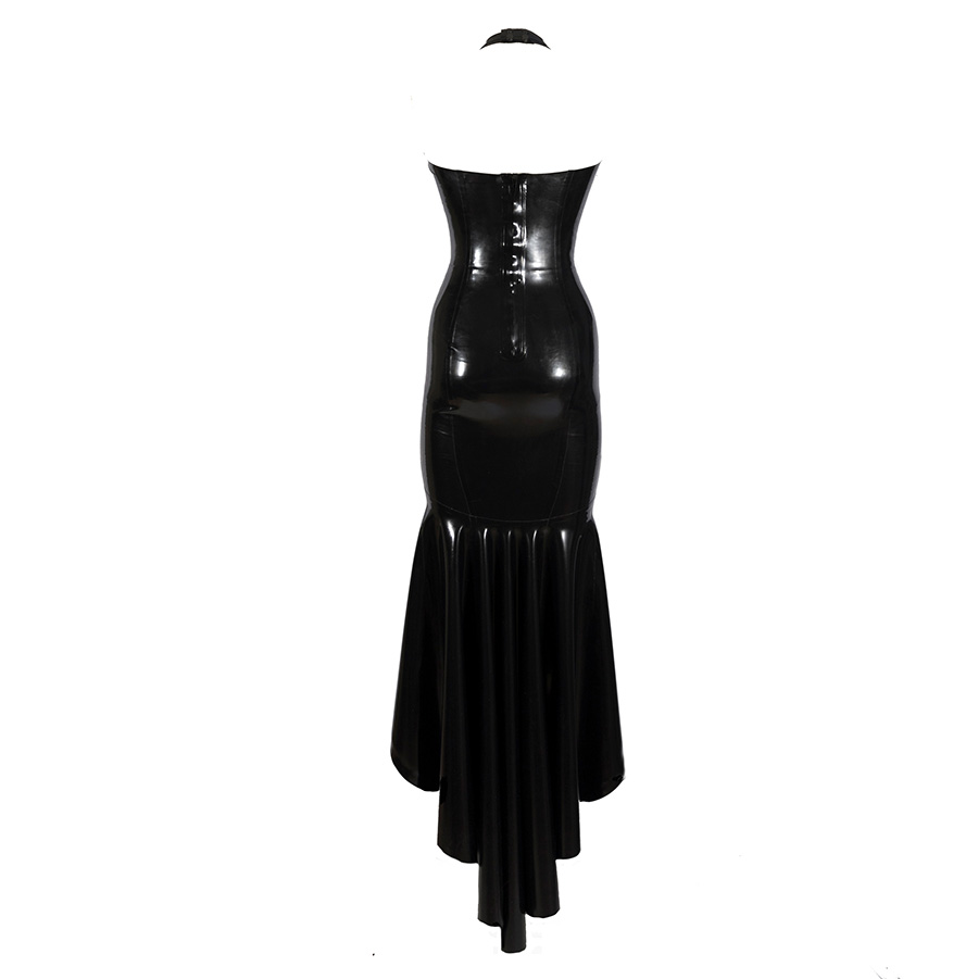 The straps fasten at the neck with poppers. The dress fastens with a zip mid back height and falls to a dramatic floor skimming fishtail hem.
