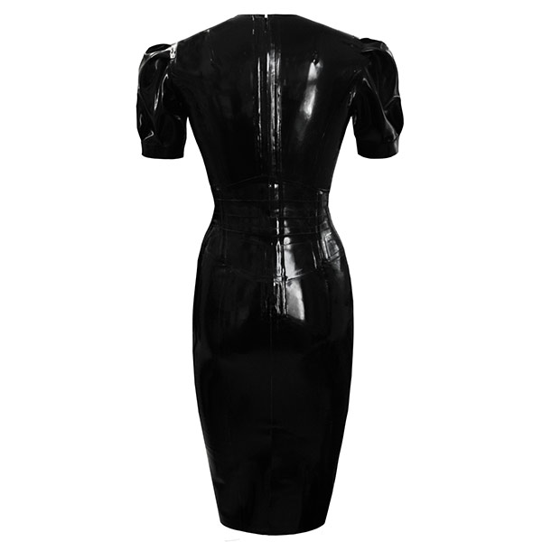The neckline slopes into a slight v shape that is complimented by the fitted puffed sleeves. The dress has a gentle curve on the hem and fits with a long zip fastening up the back to neck height.