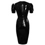 This incredibly flattering dress contours over the body giving subtle uplift at the bust and a built in waspie accentuates the waistline. The waspie has carefully constructed boning and features a decorative buckle trio.