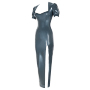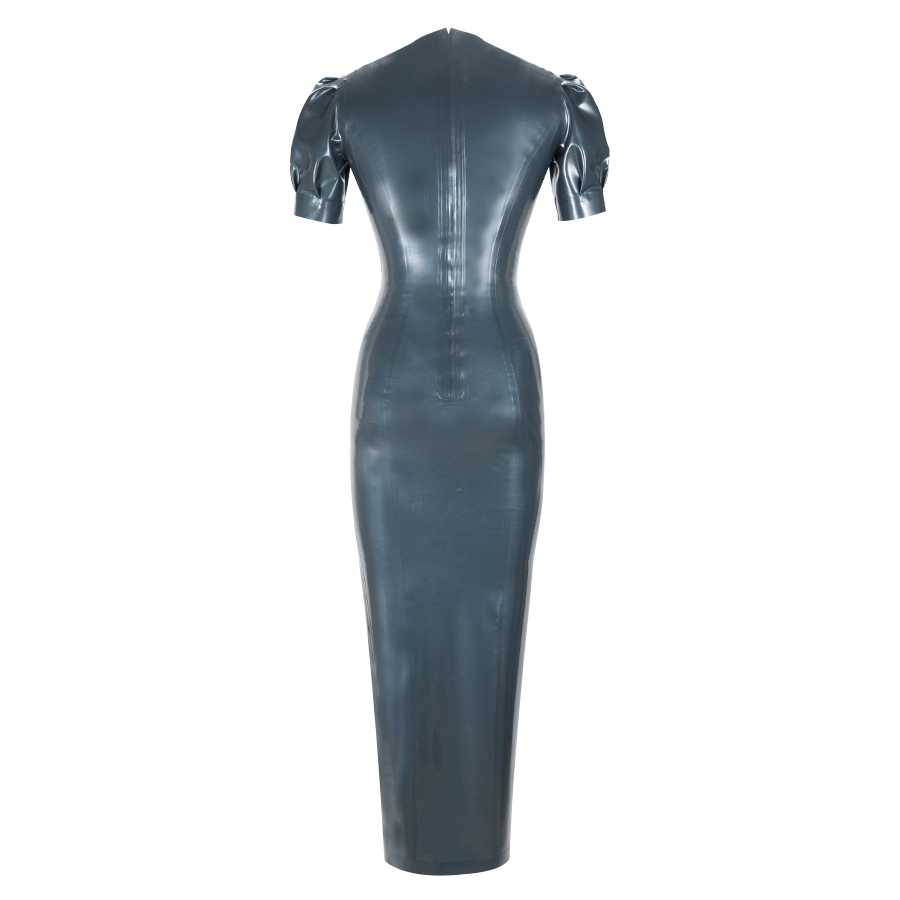 The flattering cut of the dress contours over the body to hold in your shape and give subtle uplift at the bust. The neckline features a slight v shape and is complimented by fitted puffed sleeves.