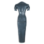 The dress is fitted closely at the waistline and the hips with an alluring front split.