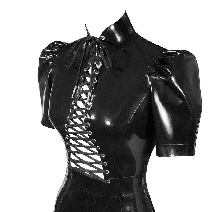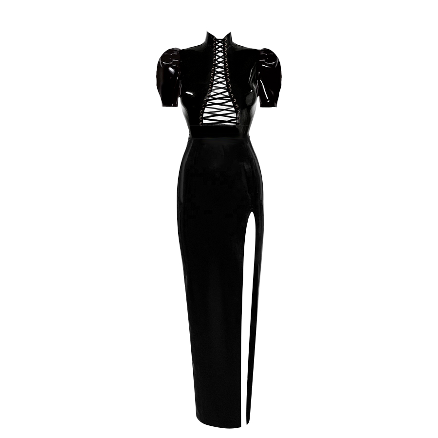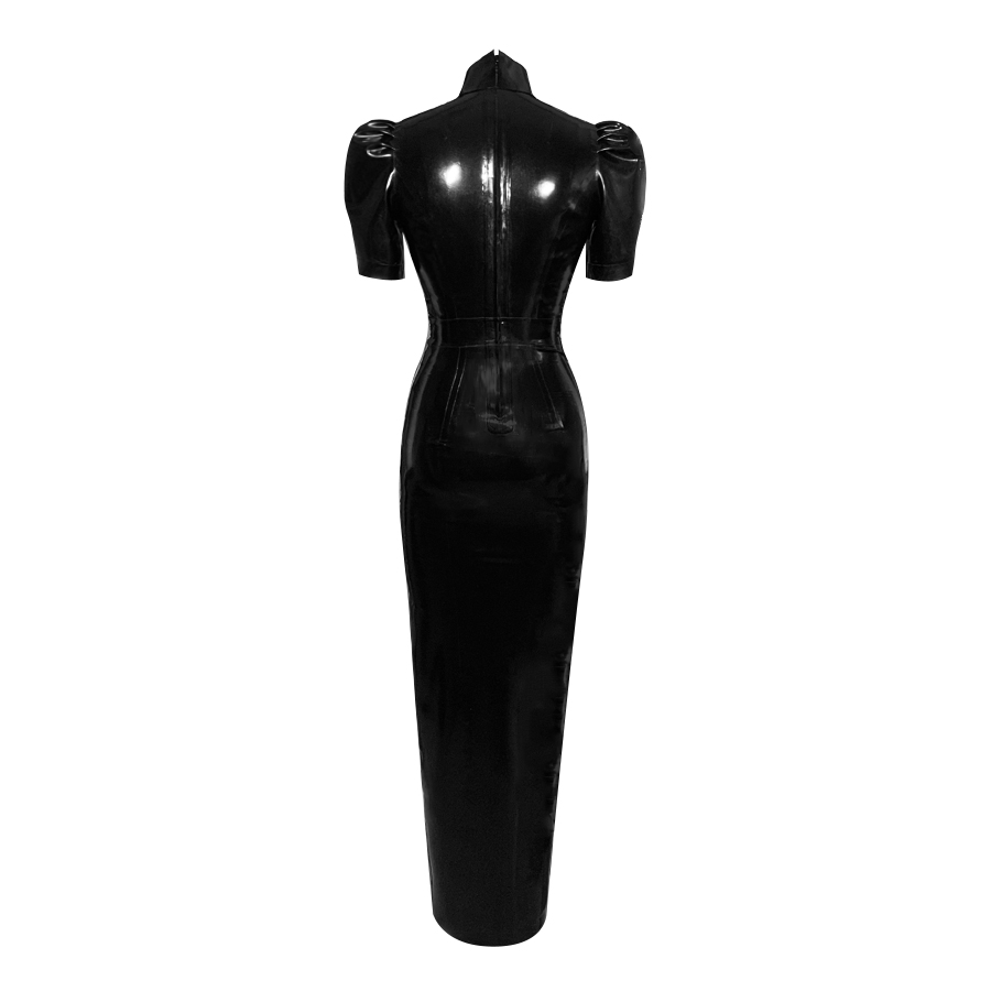 The dress sits at ankle length, has a split at the front left for ease of movement and fits with a long zip fastening up the back to neck height creating a look which is both chic and seductive. Available in the full range of latex colours.