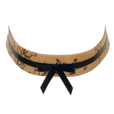 This classic choker features a single lace print band and is complimented by a contrast single trim and a decorative bow.