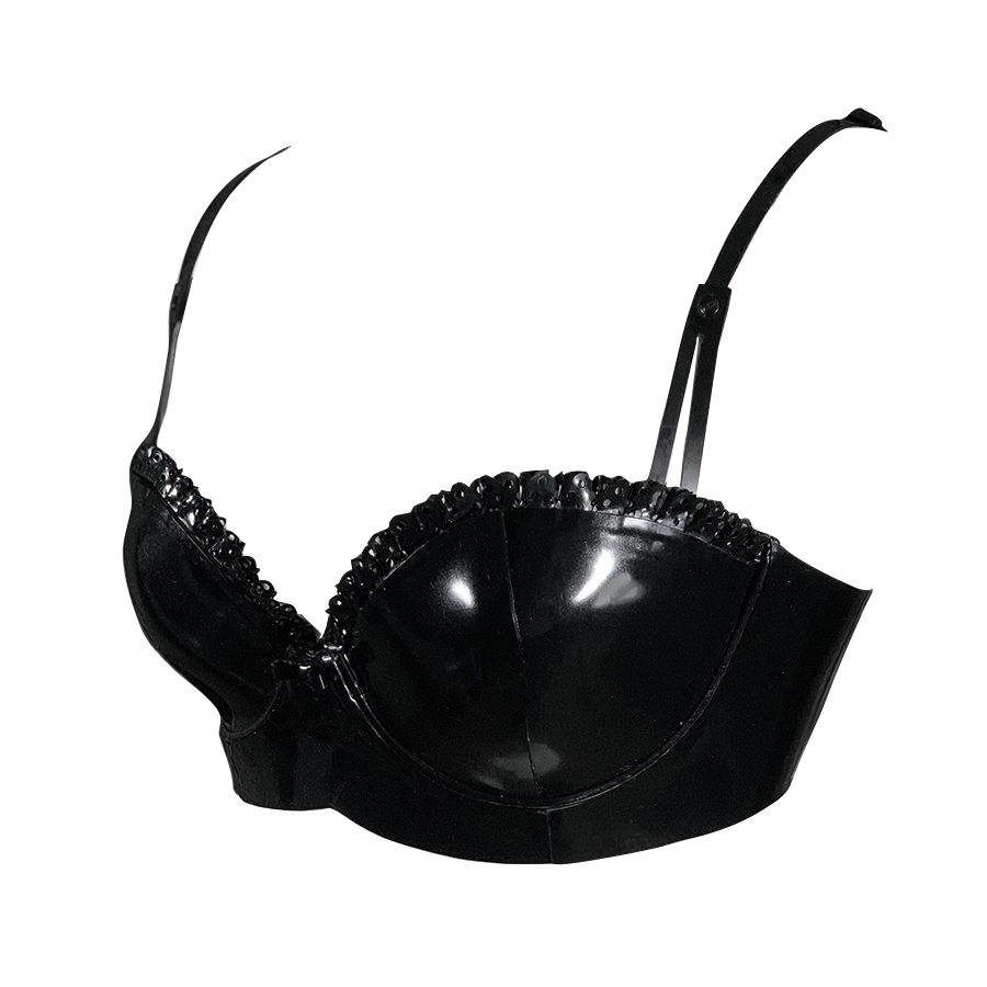 The bra has fully adjustable shoulder straps and fastens at the rear with poppers.