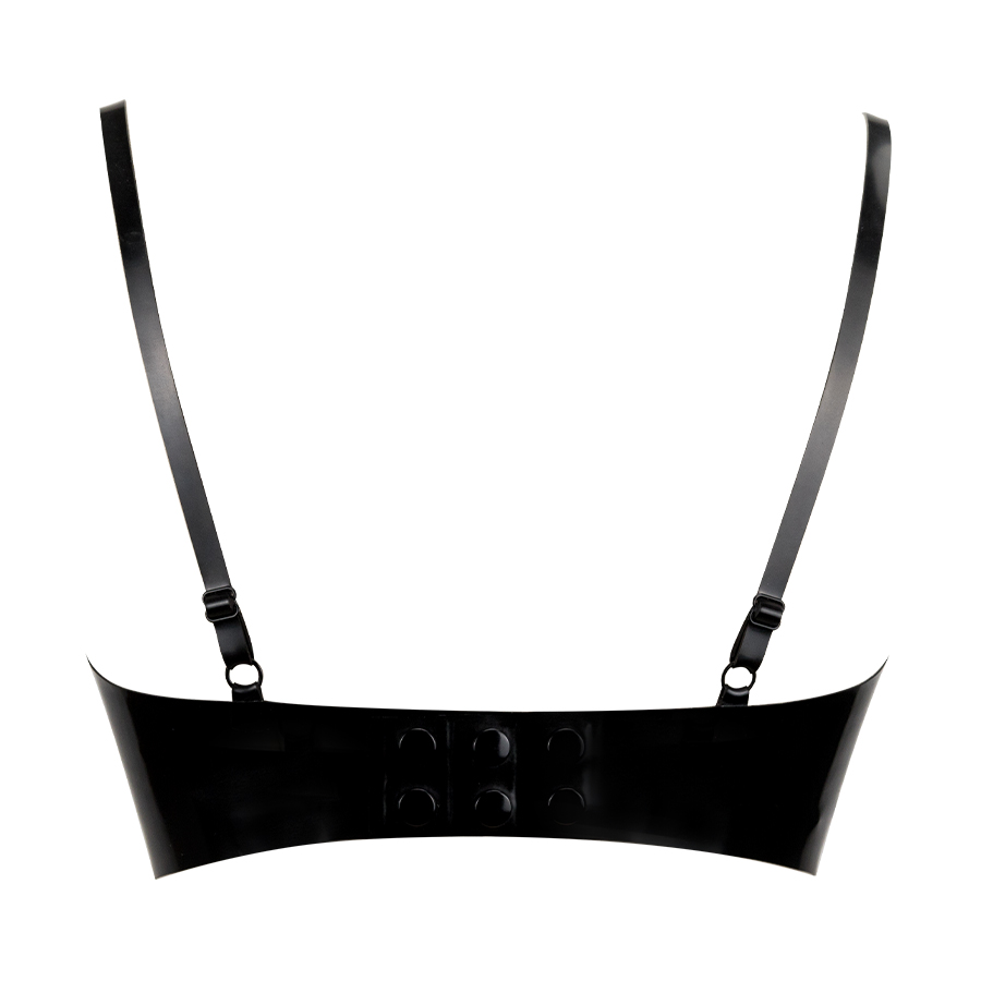 The bra has fully adjustable shoulder straps and fastens at the rear with poppers.