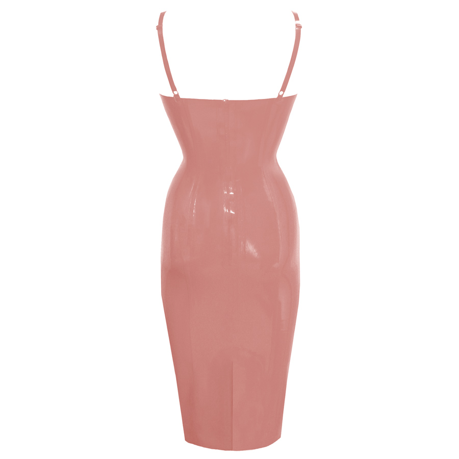 The dress sits at knee length and has a split at the centre back for ease of movement. It has fully adjustable shoulder straps and fastens with a zip to the rear.